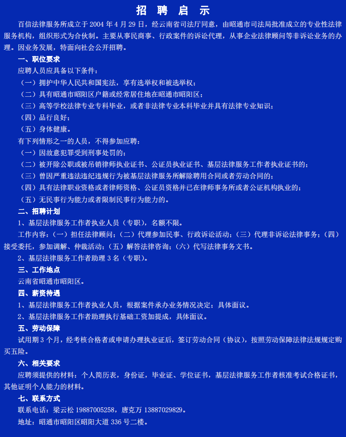 昭陽區百信法律服務所招聘啟示