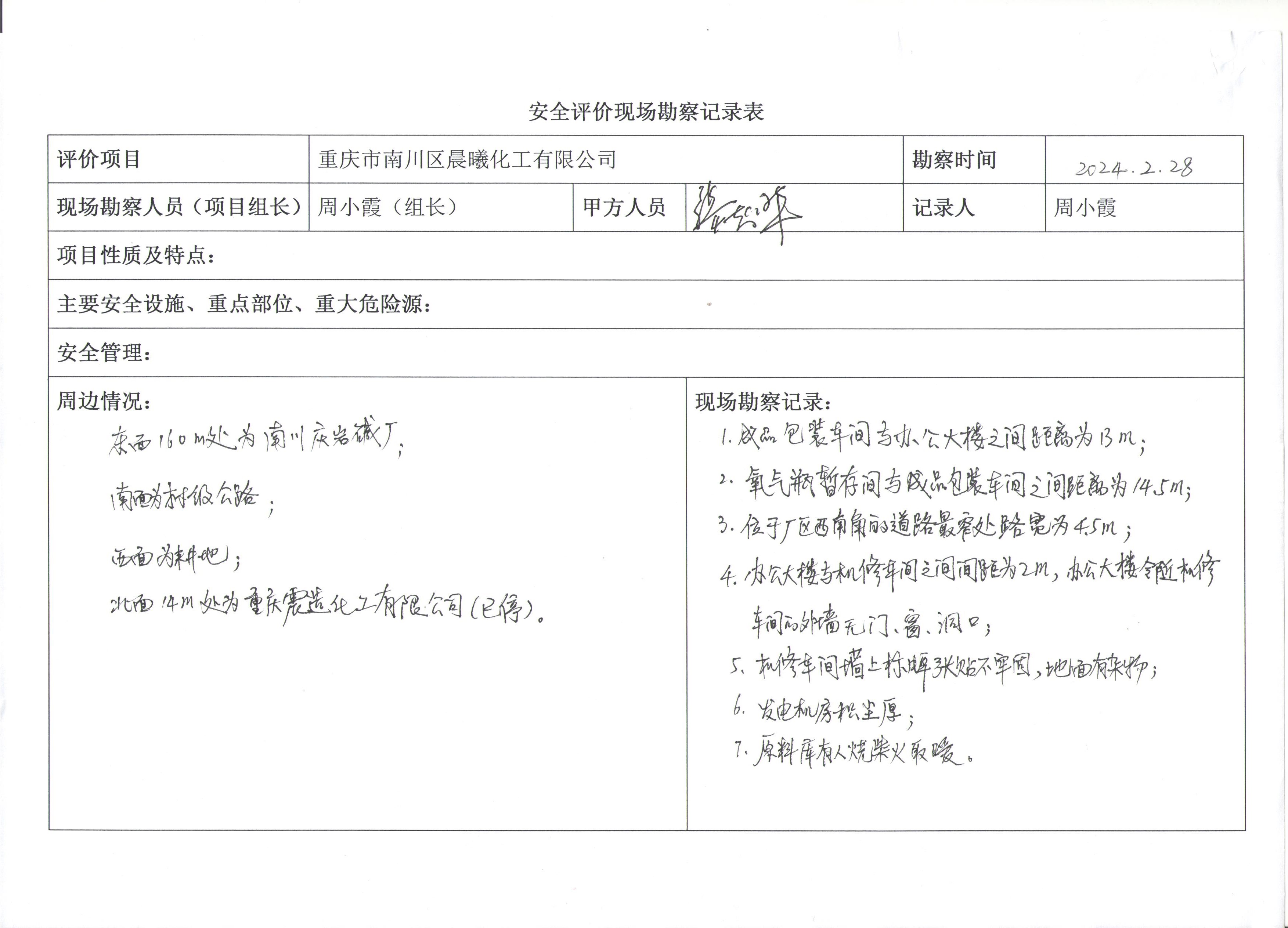 項目名稱 | 重慶市南川區晨曦化工有限公司安全現狀評價 | 合同編號 | DA(渝)-PJ-20240206 | |||||
