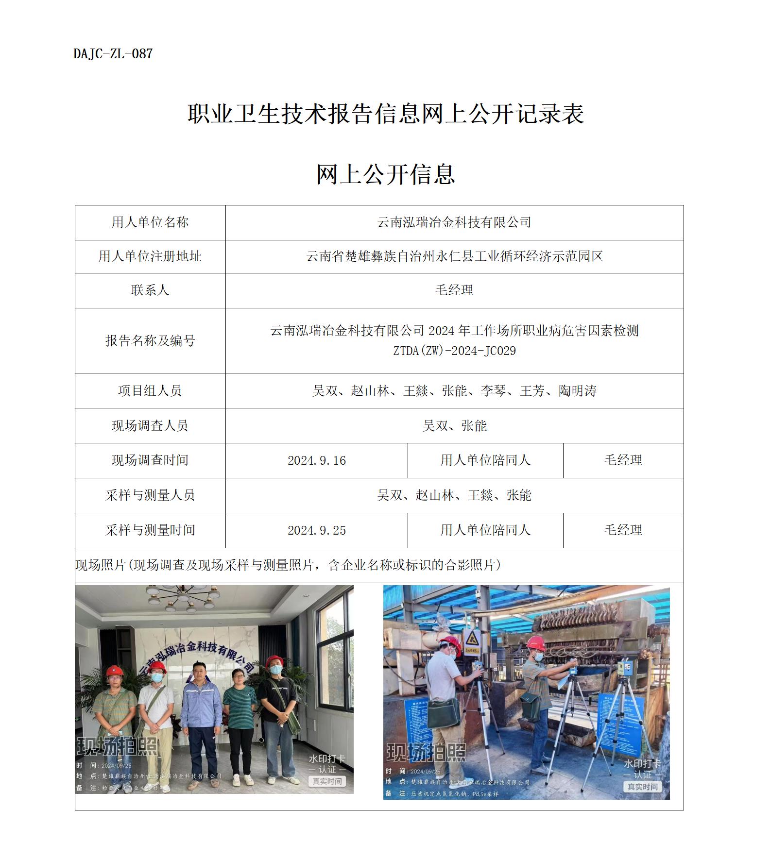 云南泓瑞冶金科技有限公司2024年工作場所職業病危害因素檢測 ZTDA(ZW)-2024-JC029